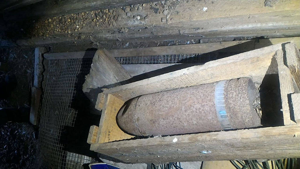 Durch die Delaborierer wurde die Granate (Länge ca. 40 cm und Breite ca. 13 cm) auf mögliche Treibmittel überprüft und das Geschoss als nicht mehr funktionsfähig eingestuft.