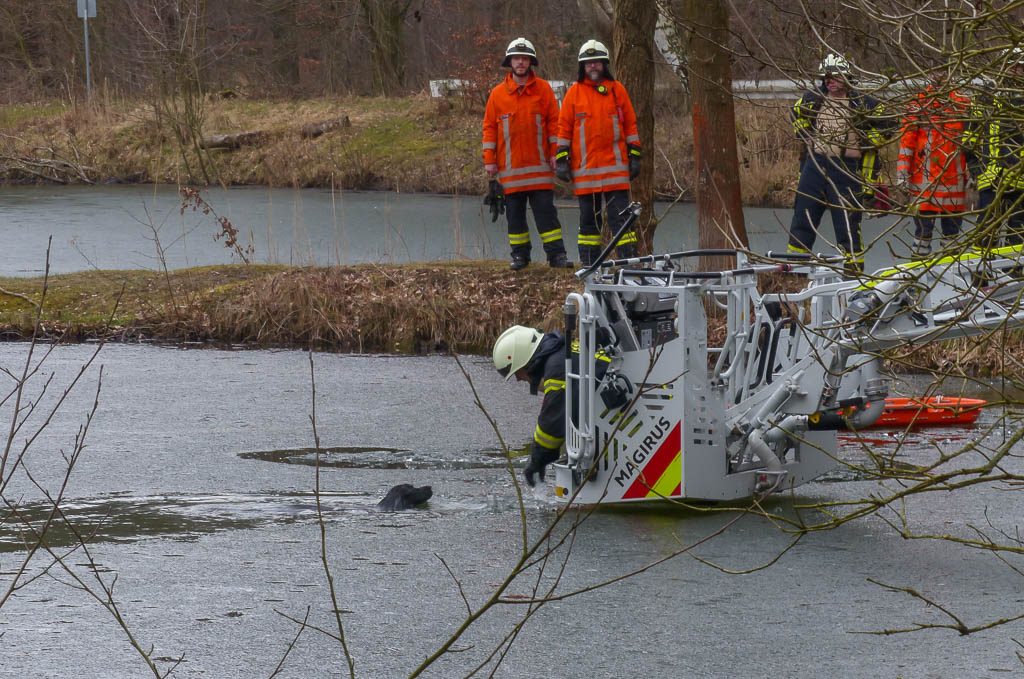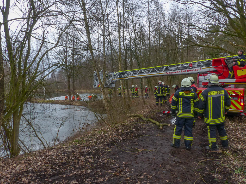(Haste) Mehrere Feuerwehren der Samtgemeinde Nenndorf sind heute Nachmittag gegen 16:00 Uhr zu einer Rettung eines Hundes alarmiert worden. Der Hund versuchte in einem Waldstück in Haste einen Kiesteich zu überqueren. Der Teich war von einer leichten Eisdecke überzogen, die aber unter dem Gewicht des Tieres einbrach. Gefangen von der Eisdecke schaffte es der Hund aus eigener Kraft nicht mehr alleine heraus. Die Besitzer riefen daraufhin die Feuerwehr, die kurze Zeit später mit einer hohen Anzahl von Einsatzkräften eintraf. Rettungsversuche mittels Leiter und Leinen verliefen erfolglos, da der Hund zu weit vom Ufer entfernt war.