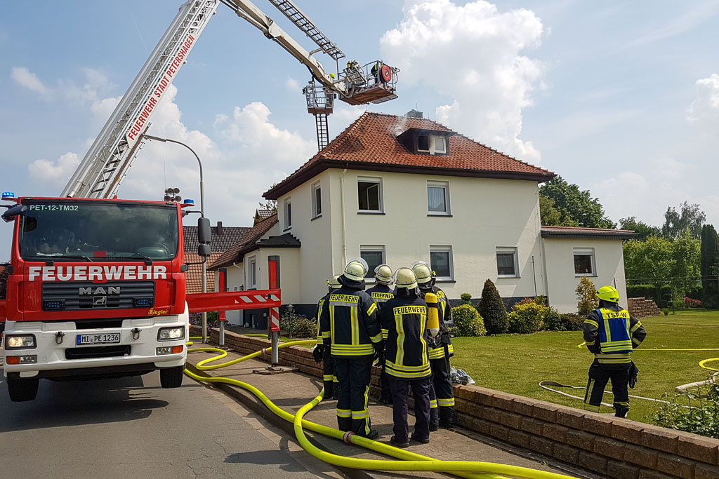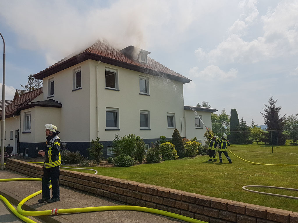 Bei Eintreffen der ersten Einsatzkräfte war bereits eine starke Rauchentwicklung aus dem Dachstuhl sichtbar, so dass umgehend ein Trupp unter schwerem Atemschutz zur Brandbekämpfung zum Brandherd vorrückte. Ein weiterer Trupp ging mit einem C-Rohr von außen zur Riegelstellung des Gebäudes vor und versuchte, die Flammen einzudämmen. Durch die Feuerwehr wurde eine Bewohnerin mit einer Rauchgasvergiftung an den Rettungsdienst übergeben.