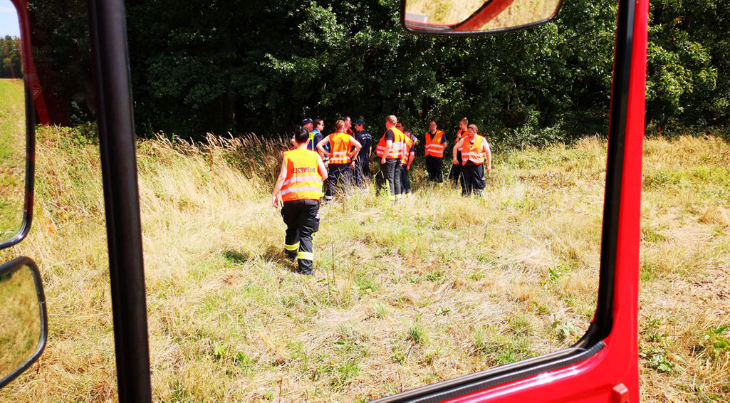 Nach einer kurzen Pause zur Stärkung, nach den anstrengenden Kilometern über Stock und Stein bei hochsommerlichen Temperaturen, wurde der Einsatzschwerpunkt verlagert. Suchhunde hatten eine Fährte bis südlich der B83 bei Selliendorf aufgenommen, so dass nun auch die Fischteiche, die Lulu-von-Strauß-und-Torney-Straße, das Mausoleum und der Schloßpark in den Blickpunkt rückten.