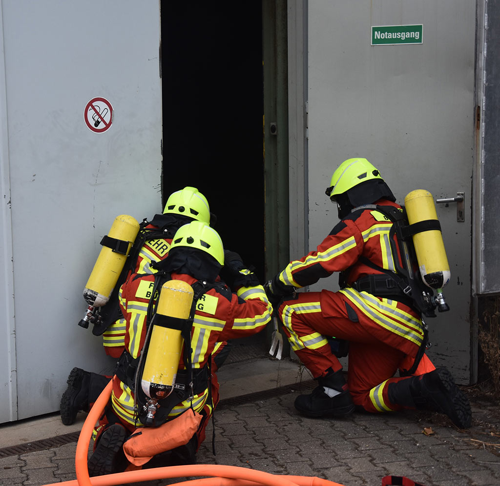 Der Angriffstrupp ging unter schwerem Atemschutz zur Brandbekämpfung vor und löschte das „Feuer“ in der Halle.