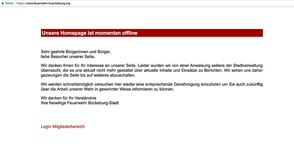 In der Mail von 1:36 Uhr heute früh schreibt der stellvertretende Zugführer Andre Märtens, dass man „aufgrund einer neuen und für uns in dieser Form überraschenden Anweisung seitens der Stadtverwaltung“ nicht mehr berechtigt sei, Einsatzberichte und ähnliche Berichte über die Aktivitäten der Feuerwehr zu veröffentlichen. Daher sah man sich auch gezwungen, die Homepage offline zu nehmen.