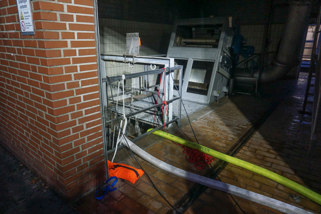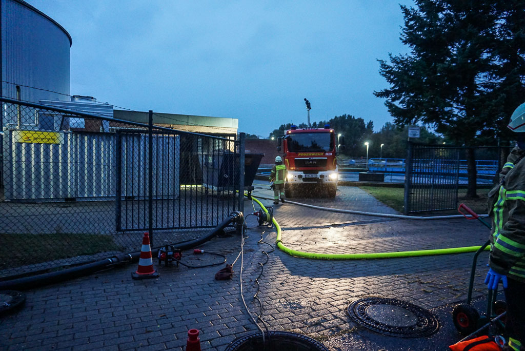 Als der Bereitschaftsdienst der Kläranlage an der Anlage ankam, kam ihm das Wasser bereits aus der Tür entgegen. Dieser informierte daraufhin die Feuerwehr und leitete das ankommende Wasser in ein Rückhaltebecken um, sodass es erst gar nicht an der Kläranlage ankommt. Die eintreffende Feuerwehr unterstützte die Mitarbeiter beim Trockenlegen der Pumpenräume. Um mehr Pumpen vor Ort zu haben wurde die Feuerwehr Enzen nachalarmiert. Da es hier um eine große Menge Wasser ging, zog sich der Einsatz von 18 bis 22 Uhr hin. Das Wasser wurde mit bis zu acht Pumpen gleichzeitig aus dem Keller in die Kläranlage und zum Teil in einen Graben geleitet. Die Feuerwehren Stadthagen und Enzen waren mit 35 Einsatzkräften vor Ort. (pr/Fotos: Feuerwehr Stadthagen)