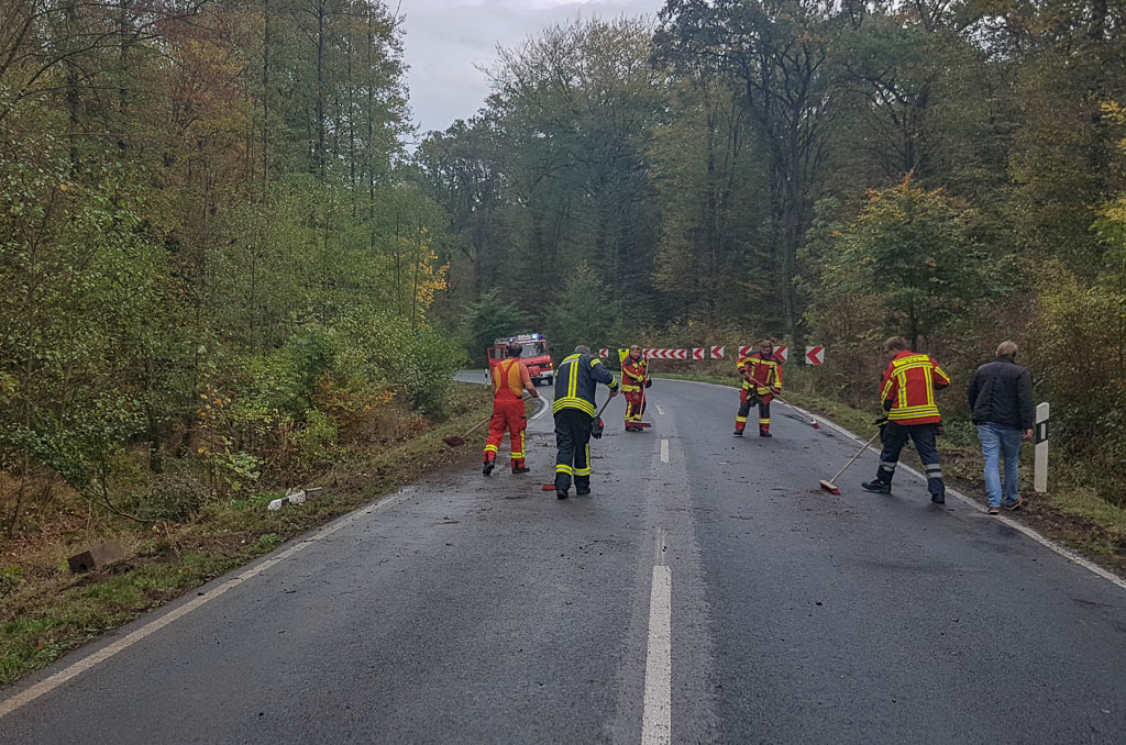 Durch die Besatzung des Rüstwagens aus Meinsen-Warber-Achum und dem Löschgruppenfahrzeug aus Rusbend wurde die Fahrbahn gereinigt und die Einsatzstelle der Polizei übergeben. (pr/Fotos: M. Gumin/Stadtpressewart Feuerwehr Bückeburg)