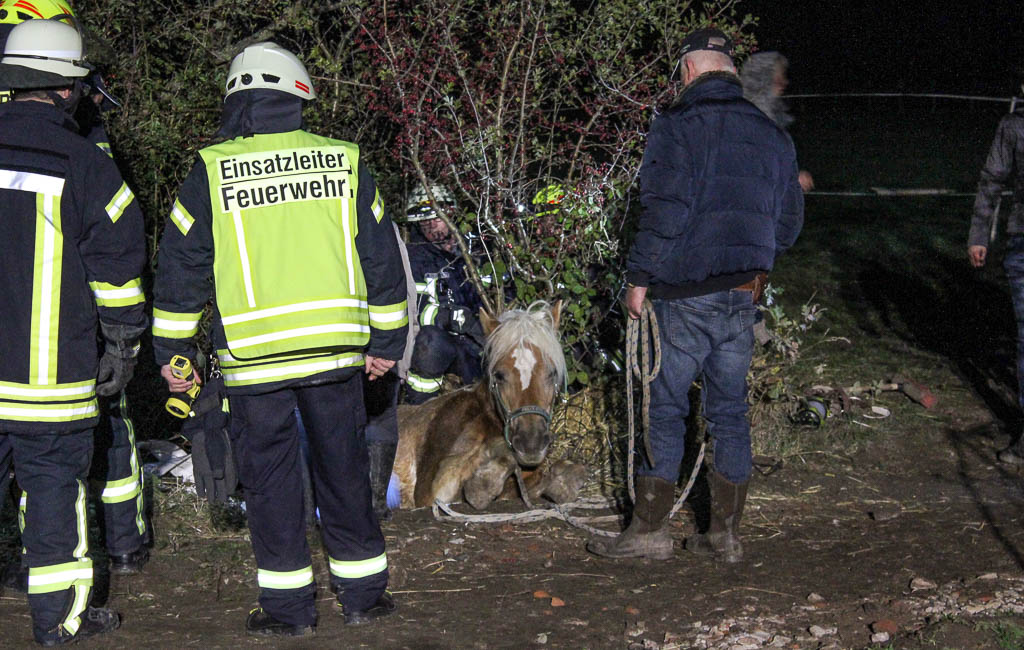 Das andere Pferd zog sich bei dem Zusammenstoß schwere Verletzungen zu und verstarb kurze Zeit später auf der Weide. Nachdem eine Tierärztin den Kreislauf des Tieres stabilisierte, wurde die Rettung durch die Feuerwehr vorbereitet. Mit Seilen und Schläuchen, die unter dem Tier hindurchgezogen wurden, gelang es das Pferd nach mehreren Anläufen aus dem Graben zu ziehen. Nach der geglückten Rettung unterstützen die Feuerwehrkameraden bei der Versorgung des Tieres. Nach rund drei Stunden konnte die Feuerwehr wieder einrücken. (pr/Fotos: Feuerwehr Sachsenhagen)