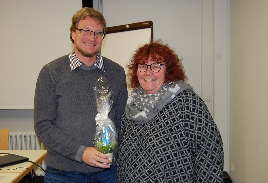 Foto 2: Fraktionsgeschäftsführerin Cerstin Bayer bedankt sich bei Thomas Hoffmann mit einem kleinen Präsent.