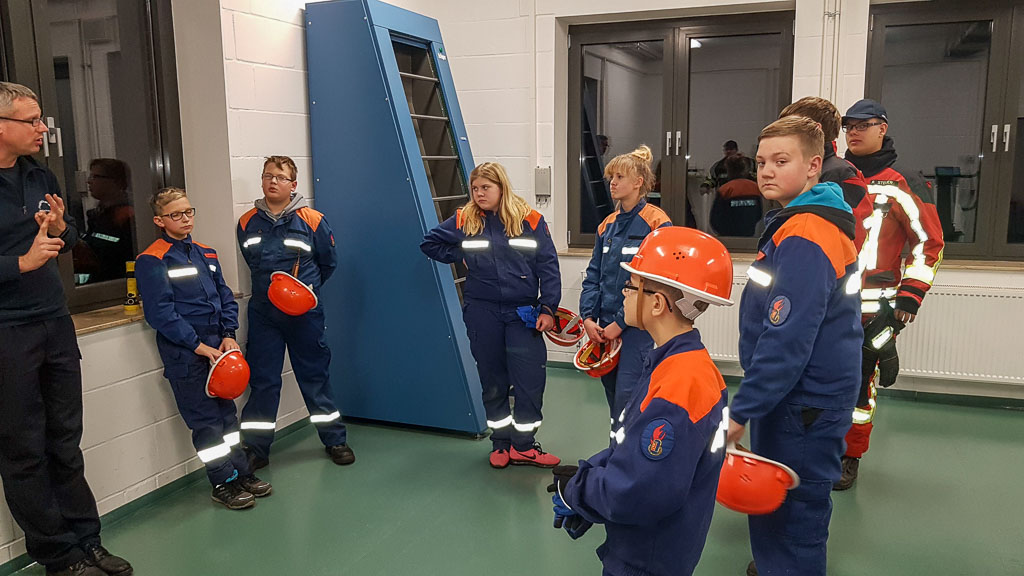 Gerade war die Besichtigung der Feuerwache abgeschlossen, schon ertönte der erste Alarm an diesem Abend, „Gebäudebrand – Personen in Gefahr“ hieß die Meldung für die Nachwuchslöscher. Vor Ort wurde ein Feuer, simuliert mit Blitzleuchten, außerhalb des Gebäudes lokalisiert und durch den Angriffstrupp gelöscht. Da der Rauch in das Gebäude gezogen war, wurde dieses von den Jugendlichen nach Personen abgesucht, hierbei unterstützten die Aktiven mit einem Atemschutzteam. Glücklicherweise fanden sie keine Personen und konnten im Anschluss den Jugendlichen das Absuchen von Räumen nach Personen zeigen.