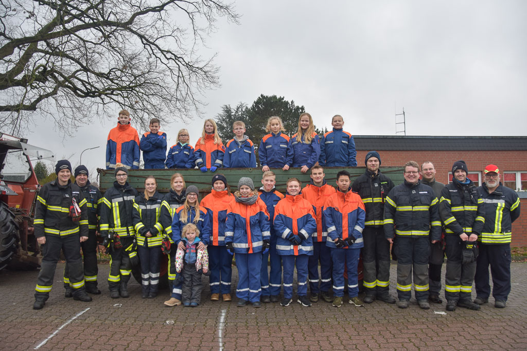 Hier machten sich die 16 Löschtiger und 13 Jugendlichen mit ihren Betreuern und Helfern auf dem Weg und sammelten hunderte ausgediente Tannenbäume ein und brachten diese mit Hilfe von 6 Trecker-Gespannen zur Entsorgungsfirma Tönsmeier in den Hafen Berenbusch. Dort werden die Bäume weiter verarbeitet. Hierfür möchten sich die Jugendfeuerwehren nochmals bei der Firma Tönsmeier bedanken.