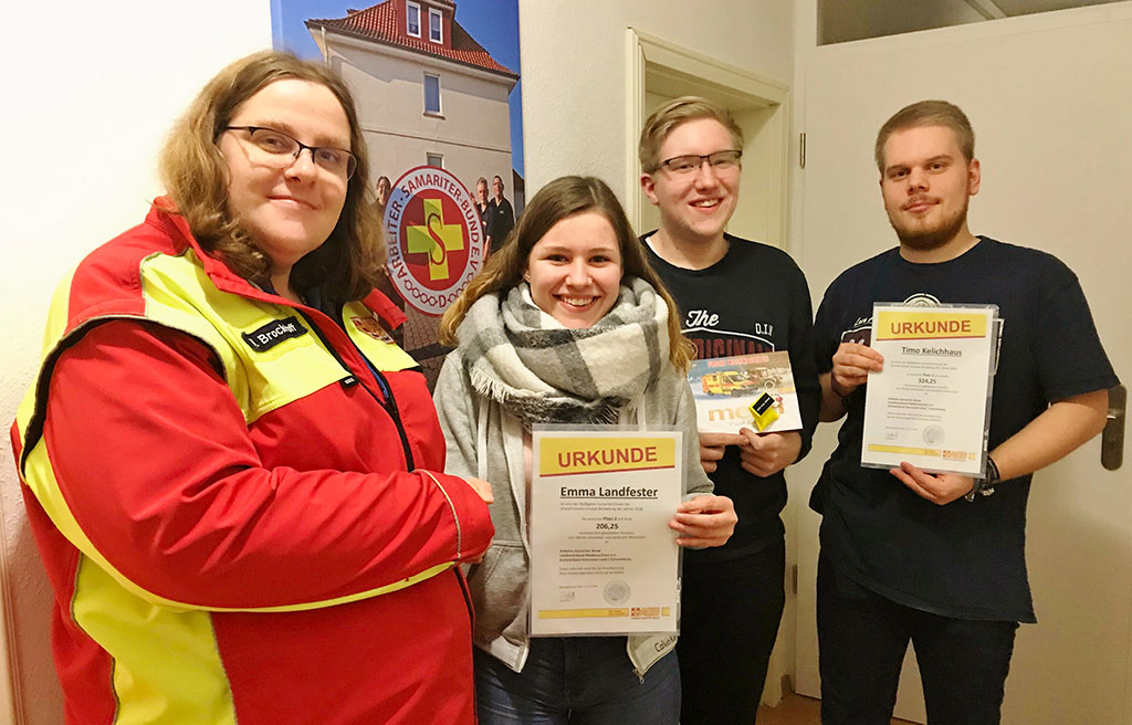 (Bückeburg) Die Samariter der Schnelleinsatzgruppe (SEG) des ASB-Stützpunktes Bückeburg haben das Jahr 2018 abgeschlossen und ihre aktivsten Helfer geehrt. Hierbei konnte Timo Kelichhaus mit 324,25 Dienststunden den Siegerpokal und die damit verbundene Urkunde im Empfang nehmen. Gefolgt wurde er von Emma Landfester mit 206,25 Stunden und Leon Rosolleck mit 193 Stunden, die ebenfalls mit einer Urkunde aus den Händen von Stützpunktleiterin Nadine Brockhoff für ihr ehrenamtliches Engagement ausgezeichnet wurden.