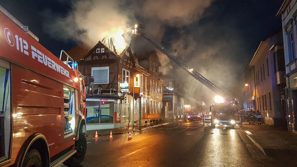 Insgesamt kamen 15 Trupps im Innenangriff und vier Trupps über die Drehleiter zum Einsatz, so konnten die Nachbargebäude erfolgreich vor einem Übergriff gerettet werden. Die benachbarten Wohnhäuser wurden die Feuerwehr vorsorglich kontrolliert. Um genug Atemschutzgeräteträger vorzuhalten wurde im weiteren Verlauf der Löschzug Nord der Feuerwehr Bückeburg nachalarmiert.