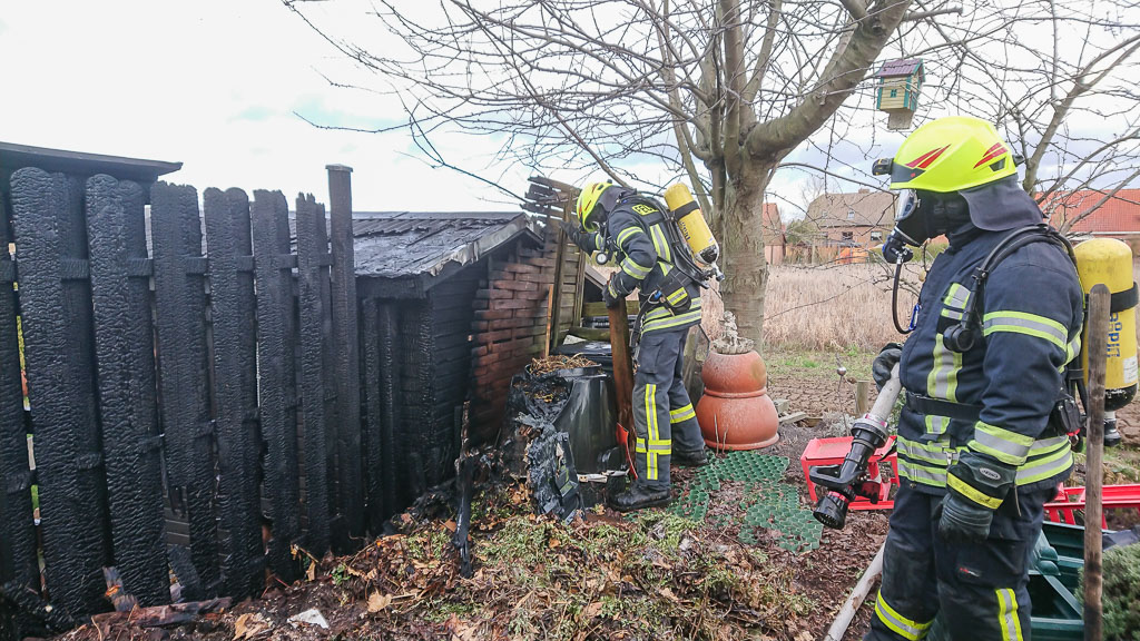 Bei Eintreffen der Feuerwehr hatten Anwohner bereits erste Löschmaßnahmen mit Feuerlöschern durchgeführt. Bei den Löschversuchen zog sich ein Anwohner eine leichte Rauchvergiftung zu und musste vom Rettungsdienst behandelt werden. Trotz der ersten Bemühungen der Anwohner breitete sich das Feuer auf ein angrenzenden Schuppen aus und beschädigte diesen.