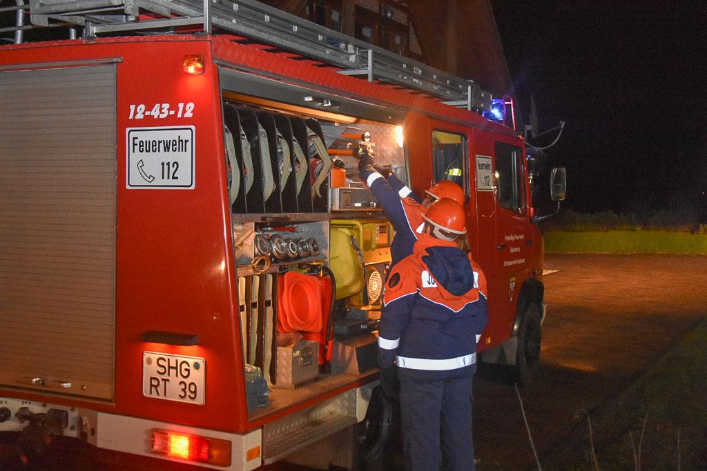 Kurz nach dem Aufräumen schlug Jonas Raeke Alarm. Zügig aber ruhig zogen sich die Jugendlichen Ihre Uniform an, stiegen auf die Löschfahrzeuge und fuhren zum Übungsort.
