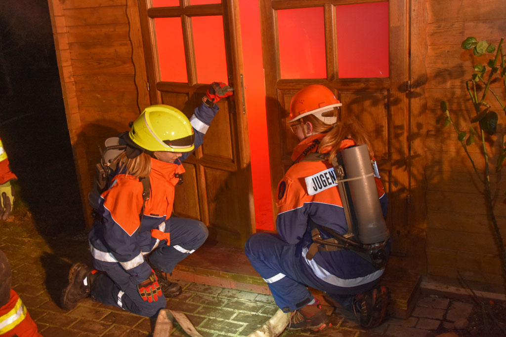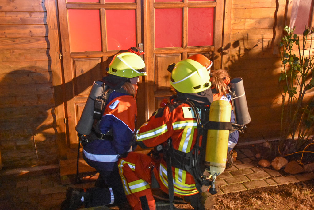 Vor Ort eingetroffen wurde von der Mannschaft die Übungslage erkundet und zügig mit der Brandbekämpfung begonnen. Für die Jugendlichen wurden extra nachgebaute Atemschutzgeräte-Attrappen organisiert, so wurden sie von zwei Atemschutzgeräteträgern an die Hand genommen.