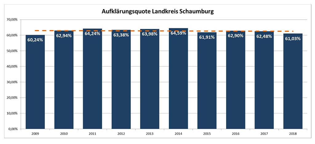 Ungeachtet eines leichten Rückgangs von 1,45 % gegenüber dem Vorjahr bleibt die Aufklärungsquote im Landkreis Schaumburg mit 61,03 % weiterhin stabil auf einem vergleichsweise hohen Stand.