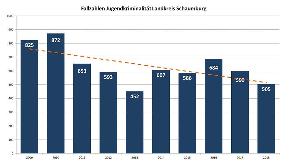 Der 10-Jahrestrend weist einen deutlichen Rückgang der Jugendkriminalität aus. So ist nach einem kurzfristigen Anstieg im Jahr 2016 in den vergangenen beiden Jahren die Anzahl der durch Minderjährige begangenen Straftaten im Vergleich zum Vorjahr erneut um 94 Taten auf 505 Fälle gesunken.