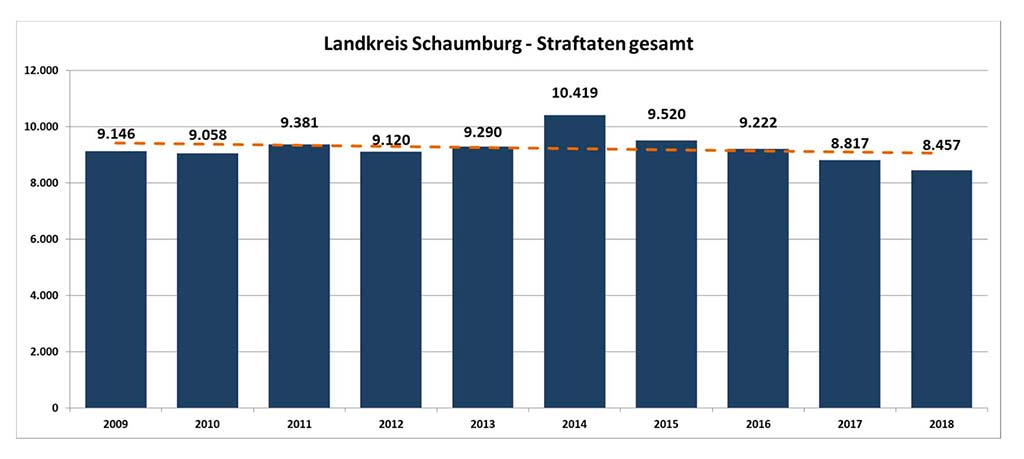 Die Polizeiinspektion Nienburg/Schaumburg hat die Kriminalstatistik für das Jahr 2018 veröffentlicht. Frank Kreykenbohm, Leiter der Polizeiinspektion Nienburg/Schaumburg, erklärt: „Die in 2018 registrierten 8.457 Straftaten stellen den niedrigsten Wert der letzten 30 Jahre dar und bestätigen den Trend zurückgehender Kriminalität auch in unserem Zuständigkeitsbereich. Bei einem ohnehin vergleichsweise geringen Kriminalitätsaufkommen in der Region, hat sich die Gefahr, Opfer einer Straftat zu werden, für die Bürgerinnen und Bürger im Landkreis Schaumburg noch einmal deutlich reduziert, was sich hoffentlich auch positiv auf das subjektive Sicherheitsgefühl auswirkt. Umgerechnet auf 100.000 Einwohner wurden 5.408 Straftaten begangen (sogenannte Häufigkeitszahl). Im gesamten Land Niedersachsen liegt die Zahl bei 6.362 Straftaten je 100.000 Einwohner. Damit kann die Kriminalitätsbelastung im Landkreis Schaumburg nach wie vor als erfreulich gering bezeichnet werden.“