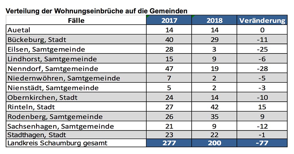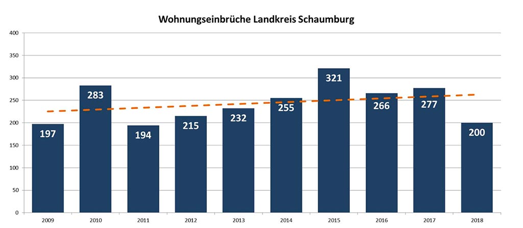 Die Aufklärungsquote beim Wohnungseinbruchdiebstahl im LK Schaumburg beträgt 43,00 % (+ 19,17 %) und liegt damit weit oberhalb des Landesdurchschnitts von 24,89 % und noch deutlicher über dem Bundesdurchschnittswert von 17,8 %1 (2017 / Daten für 2018 noch nicht erhältlich). .