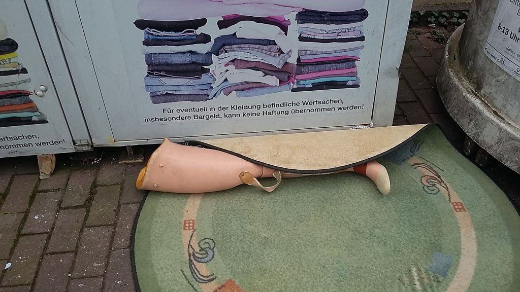 (Bad Eilsen) Sanft auf einem Teppich gebettet wurde in Bad Eilsen vor den Altkleidercontainern an der Bückeburger Straße eine ausgediente Beinprothese zur letzten Ruhe abgelegt aber dennoch unsachgemäß entsorgt.