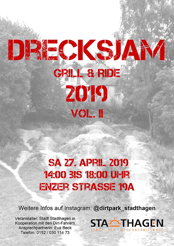 (Stadthagen) Die Stadtjugendpflege der Stadt Stadthagen veranstaltet in Kooperation mit den jugendlichen Benutzern des DirtParks am Samstag, dem 27. April 2019 von 14:00 bis 18:00 Uhr zum zweiten Mal die Sportveranstaltung namens „Drecks-Jam“ auf und rund um den DirtPark. In diesem Jahr liegt der Schwerpunkt auf einem entspannten „Grill & Ride“.