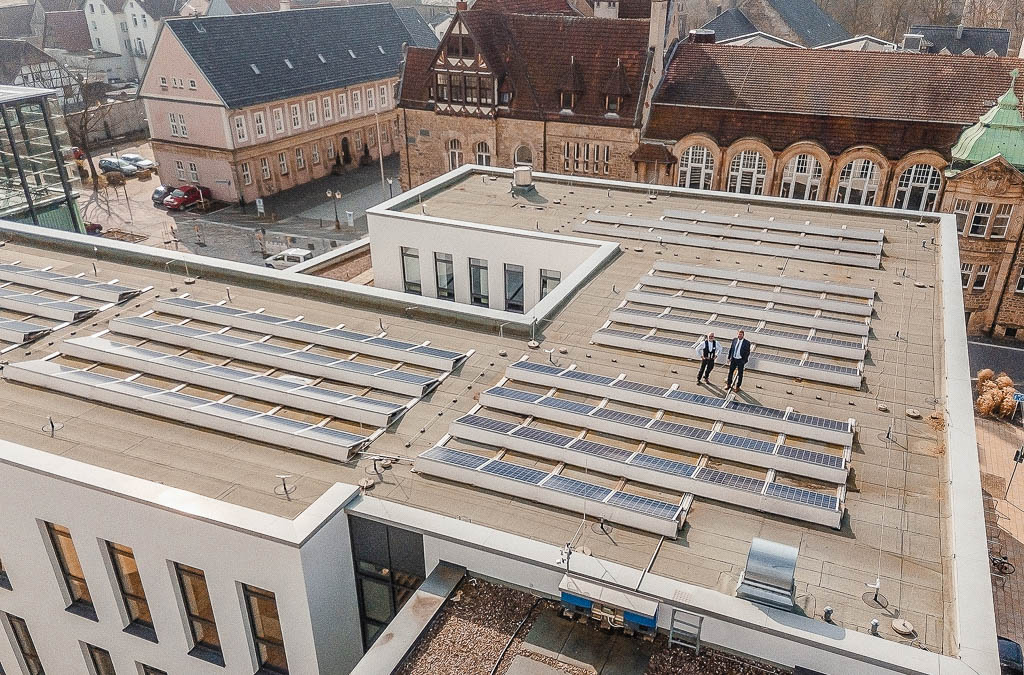 Für die aktuelle Vorstellung des Programms kamen Oliver Schiller und Joachim Hartmann diesmal an einem ganz besonderen Ort zusammen – auf dem Dach der Sparkassengeschäftsstelle Bückeburg. Denn auch bei den eigenen Baumaßnahmen legt die Sparkasse Schaumburg viel Wert auf die Nachhaltigkeit, vor allem bei dem Thema Energieversorgung.