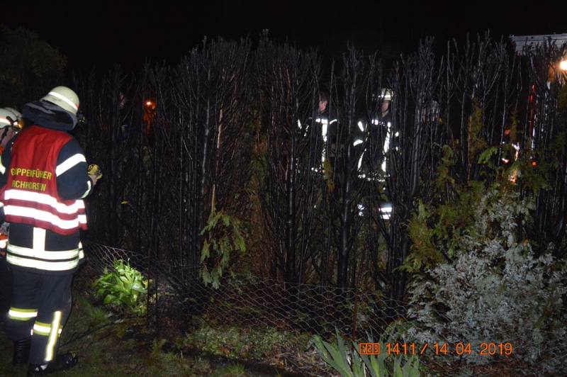 Gegen 09.00 Uhr gab es dann ein Feuer in der Voßkampstraße, wobei zunächst ein Holzlattenzaun Feuer fing und die Flammen auf die Thujahecke übergriff. Der Zaun wurde auf einer Länge von 1,80 m und die Hecke auf ungefähr 3m beschädigt.