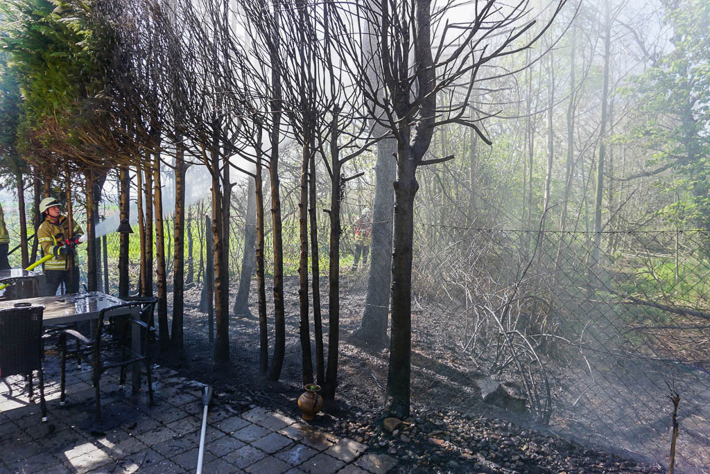 Schon von weitem war eine Rauchwolke über der Einsatzstelle zu sehen. Die ersten Einsatzkräfte fanden eine ca. 500 Quadratmeter große Fläche mit Bäumen und Sträuchern im Vollbrand vor. Die Flammen drohten bereits, auf die nur wenige Meter entfernte Gaststätte überzugreifen.