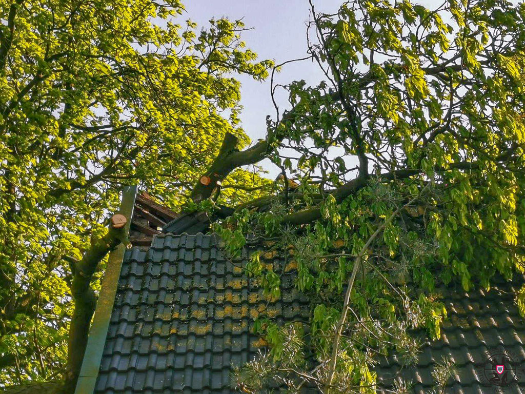 Vor Ort stellte sich heraus, dass ein etwa 600 Kilogramm schwerer Ast auf das Dach des Hauses gestürzt war und den Dachstuhl beschädigt hatte. Aufgrund der Höhe, in der der Ast lag, wurde die Hubrettungsbühne der Feuerwehr Stadthagen nachalarmiert.