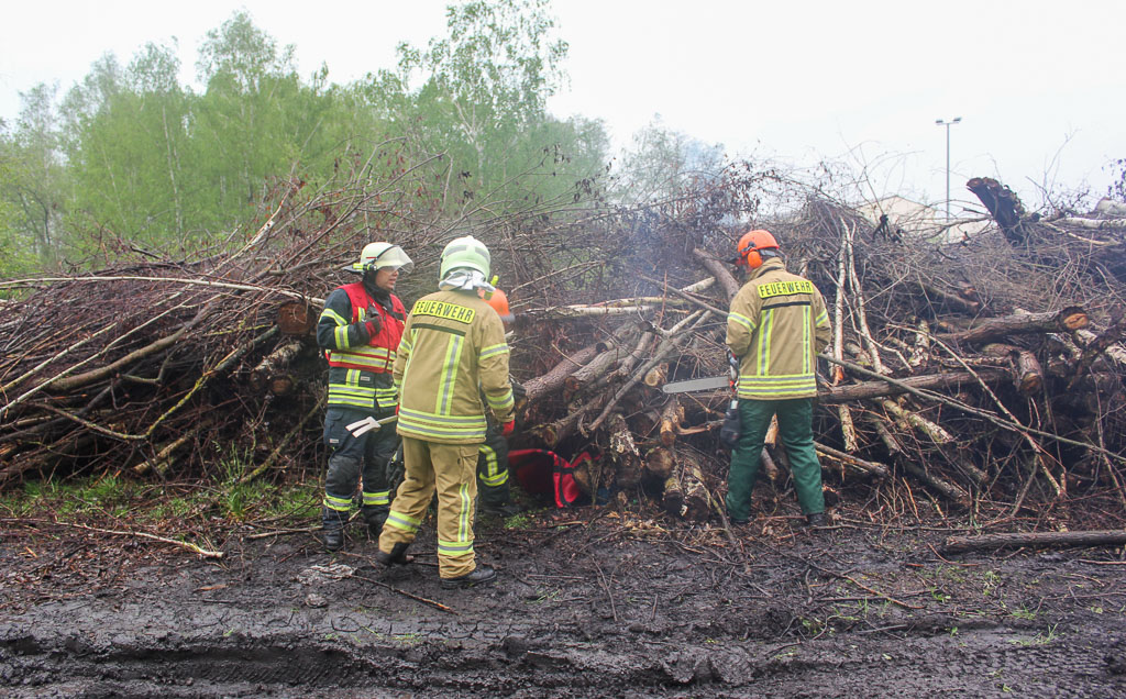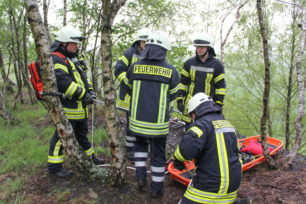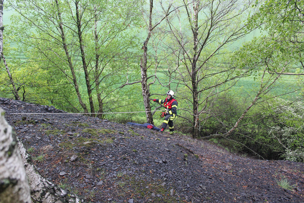 Als ein weiteres Hindernis stellten sich mehrere umgestürzte Bäume dar, die erst mit Hilfe von Motorsägen entfernt werden mussten. Unterdessen suchten Feuerwehrleute systematisch das Gelände ab, um verletzte Personen zu finden. Dabei entdeckten sie einige unter Bäumen begrabene Personen, zwei in einer alten Grube gestürzte Verletzte, sowie zwei Mountainbike-Fahrer, von denen einer etwa sieben Meter tief von der Abraumhalde gestürzt und von einem Baum gehalten wurde. Dieser wurde mit Hilfe einer Schleifkorbtrage und zwei Kameraden, sie sich zu dem Verletzten abseilten, gerettet.