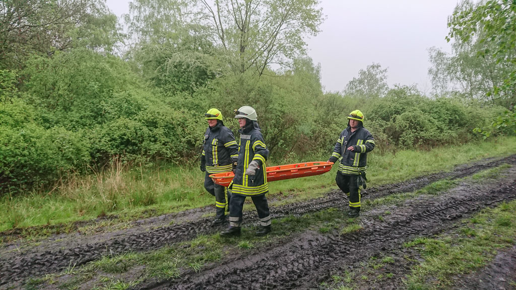 (Lüdersfeld) Am Freitagabend rückte die Kreisfeuerwehrbereitschaft Nord des Landkreises Schaumburg zu einer Großübung am Lüdersfelder Schacht aus. Nach dem Treffen am Sammelplatz Hafen Sachsenhagen erhielt die Einheit den Auftrag, bei einer Schadenslage am Lüdersfelder Schacht zu helfen. Dort kam es bei einem Lagerfeuer zu einer Verpuffung, wodurch mehrere Flächenbrände und ein Waldbrand entstanden. Mehrere verletzte Personen mussten gerettet werden. Da es nur eine Zufahrt zum Gelände gibt, die durch den Regen zudem schwer passierbar war, konnten nur geländefähige Fahrzeuge eingesetzt werden. So mussten die Feuerwehrkräfte benötigtes Material zu Fuß zu den verschiedenen Stellen auf dem Gelände bringen.
