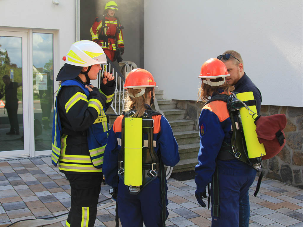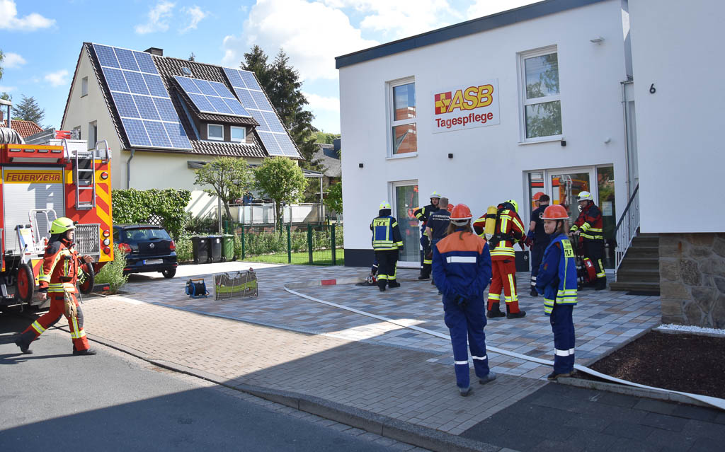 Gegen 10.00 Uhr ertönte ein weiteres Mal der Alarm. „Kellerbrand, Person in Gefahr“ hieß das Stichwort. Noch während sich die Jugendlichen und Aktiven umzogen und die Fahrzeuge besetzten, kam es zu einem realen Einsatz für die Einsatzabteilung, eine ausgelöste Brandmeldeanlage in einer Unterkunft sorgte für die Unterbrechung des Übungseinsatzes. Nachdem die erfahrenen Einsatzkräfte wieder eingerückt waren, konnte der Übungseinsatz fortgesetzt werden und so fuhren alle zur Unterkunft des ASB.