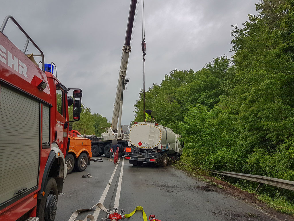Ein Bergungsunternehmen versuchte, den LKW samt Belastung aufzurichten. Dieses Vorhaben wurde aufgrund der ungünstigen Lage des LKW im Graben abgebrochen, so dass der Inhalt der Tanks durch in einen zusätzlichen Tankwagen umgepumpt werden musste. Hierzu musste die Feuerwehr auf der obenliegenden Seite zwei Öffnungen schaffen, damit die 11.000 Liter Diesel aus dem Tank abgepumpt werden konnten.