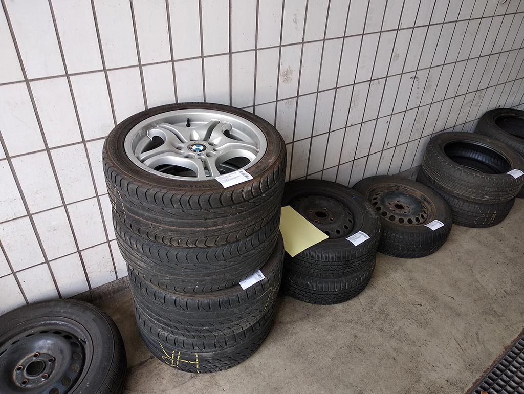 Bei den Rädern handelt es sich um 2 Reifen der Marke Semperit Speed Life auf BMW-Alufelgen in der Größe 225/45 R 17, 2 Reifen der Marke Rockstone Radial auf BMW-Alufelge in der Größe 245/45 R 17, 2 Reifen auf Stahlfelge in der Größe 195/65 R 15, (Kumho I`Zen und Continental Premium Contact 2), 2 Reifen der Marke Falken Eurowinter HS 439 auf Stahlfelge in der Größe 185/65 R 15, 2 Reifen Continental Sport Contact in der Größe 205/50 R 17 sowie 2 Reifen Continental Eco Contact in der Größe 195/55 R 16.