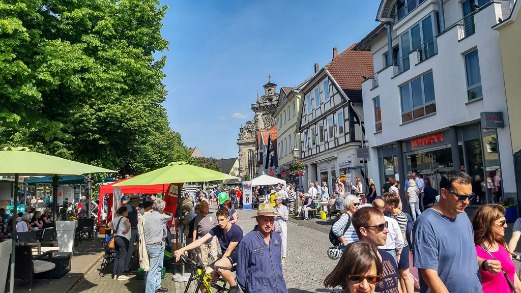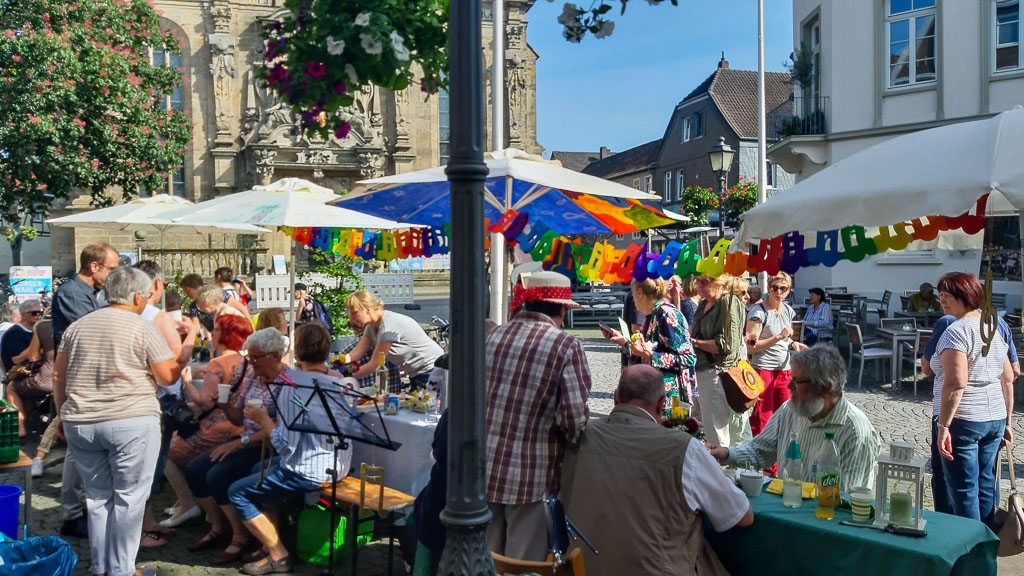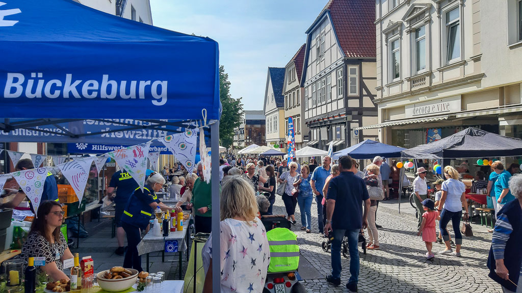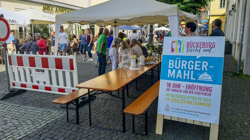 Bei 30 Grad und strahlendem Sonnenschein war ganz Bückeburg in der Zeit von 16 bis 19 Uhr in der Langen Straße unterwegs. Überall waren herrlich geschmückte und dekorierte Tische aufgebaut, an denen man sich setzten und verweilen konnte. Essen gab es reichlich und das auch noch kostenlos. Es wurde gelacht, geschwatzt und alte sowie neue Begegnungen aufgefrischt und vertieft. „Das ist ja der Sinn und Zweck des Bürgermahls“, so Mitorganisator Dr. Wieland Kastning von der evangelisch-lutherischen Stadtkirchengemeinde.
