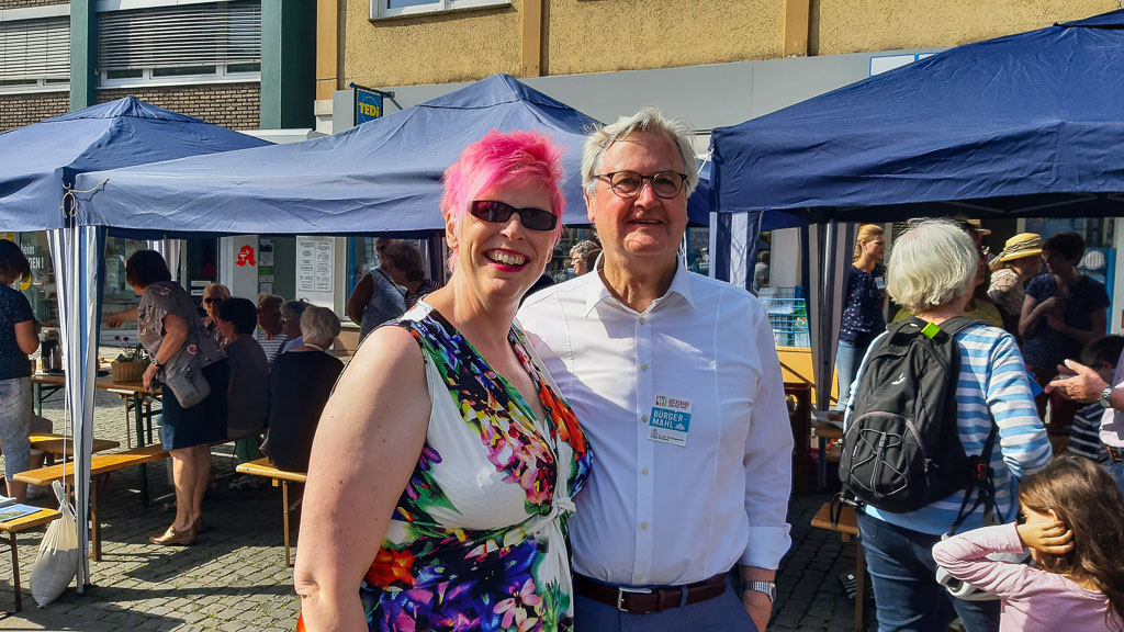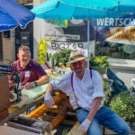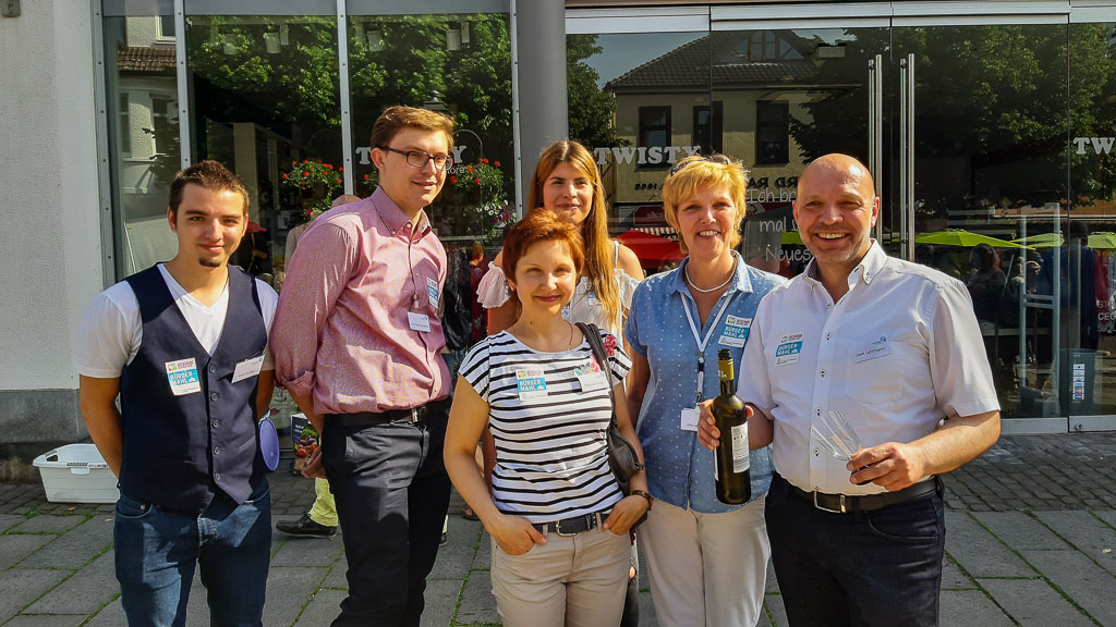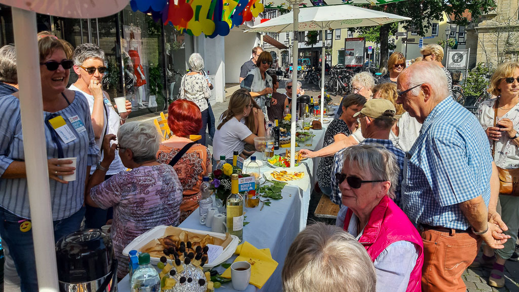 Im oberen Bereich der Langen Straße in der Nähe eines Brillenladens standen zum ersten Mal die Steuerberaterkanzlei Uwe und Ute Lattmann mit ihren Mitarbeitern: „Wir sind total begeistert und freuen uns dabei zu sein. Wir kommen mit so vielen Menschen in Kontakt, mit denen wir gar nicht gerechnet haben. Alle freuen sich über unsere Fruchtspieße und die Getränke. Wein möchte aber bei dem Wetter keiner trinken.“