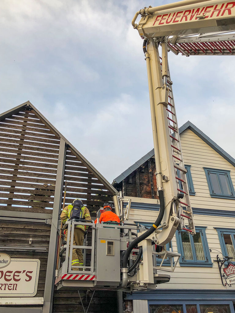 Laut Einsatzmeldung sollte ein Gebäude in Flammen stehen und sich Personen in Gefahr befinden. Bei Eintreffen des Einsatzleitdienstes war auch eine Rauchentwicklung bei einem Restaurant mit Holzfassade zu erkennen. Es brannte in einem Kabelschacht zwischen zwei Gebäuden.
