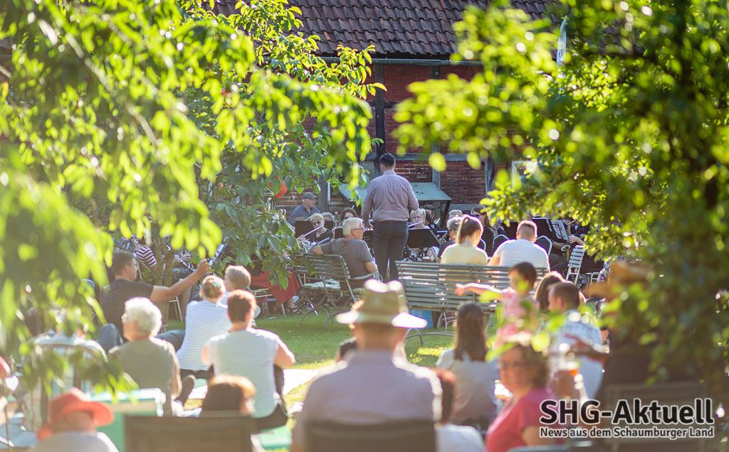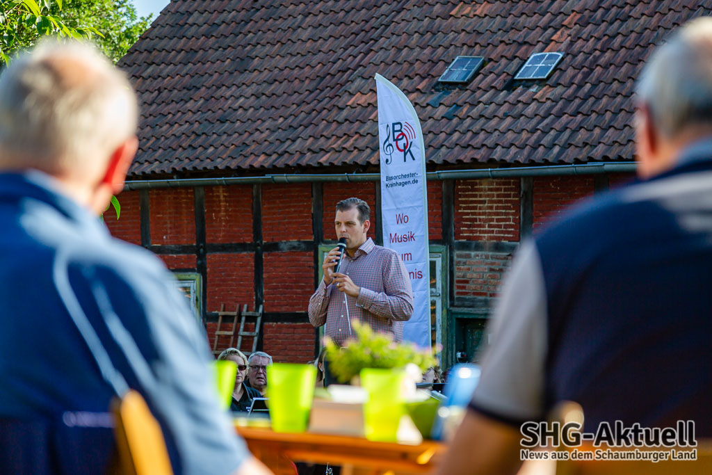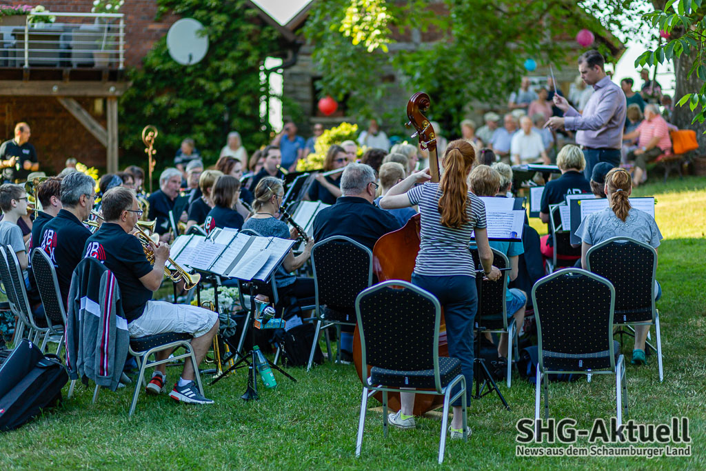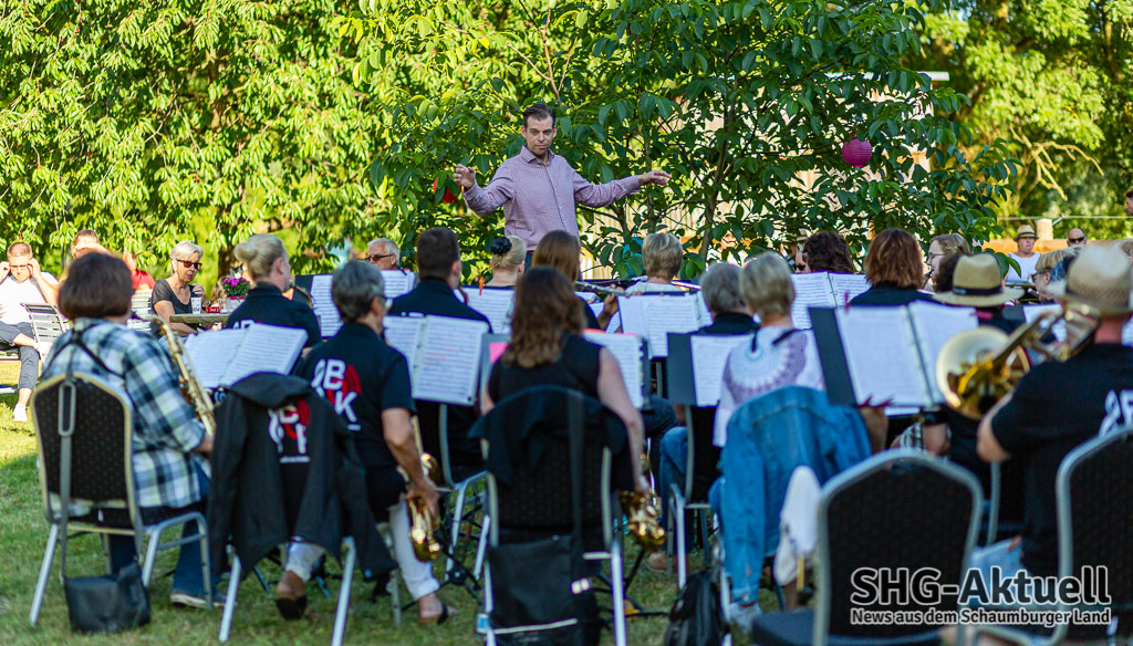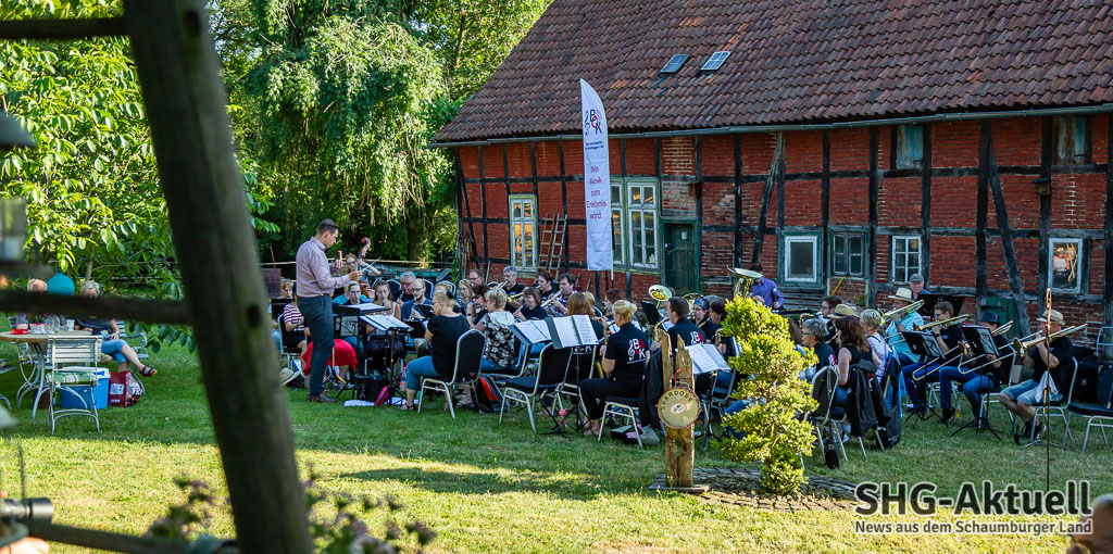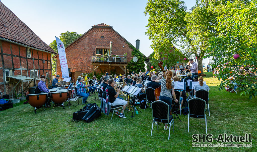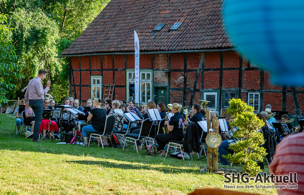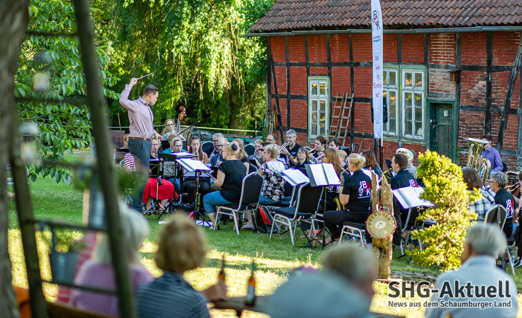 Doch, eins fehlt: Gute Musik. Die kam an diesem Freitagabend vom Blasorchester Krainhagen. Die Musiker unter der Leitung von Dirigent Roman Reckling begrüßten die Gäste vor der Sommerpause zu einem Picknick-Konzert auf dem Antik-Hof Ehrlich in Röhrkasten und verwandelten das Grundstück in einen „Konzertsaal“. Die Platzierung der Band war übrigens keinesfalls zufällig gewählt. Mit dem Gebäude im Rücken spielt es sich akustisch eben ganz anders, als auf freier Fläche. Oder wie es Reckling umschrieb: „Im Zelt und auf der Wies´ klingts mies.“