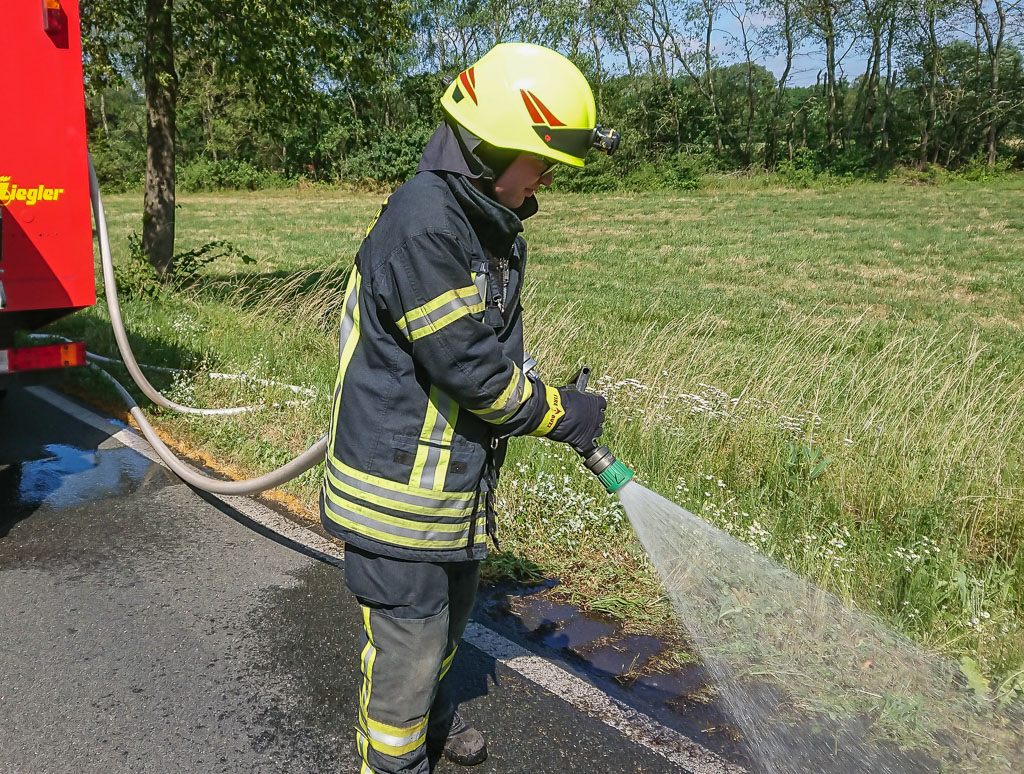 An der Landesstraße 445, kurz vor dem Kreisel „Dreiländereck“ brannte es auf einer Fläche von etwa 5 Quadratmeter. Mit dem Schnellangriffsschlauch des Auhäger Fahrzeug wurde das Feuer schnell gelöscht und die Umgebung ordentlich gewässert. (pr)