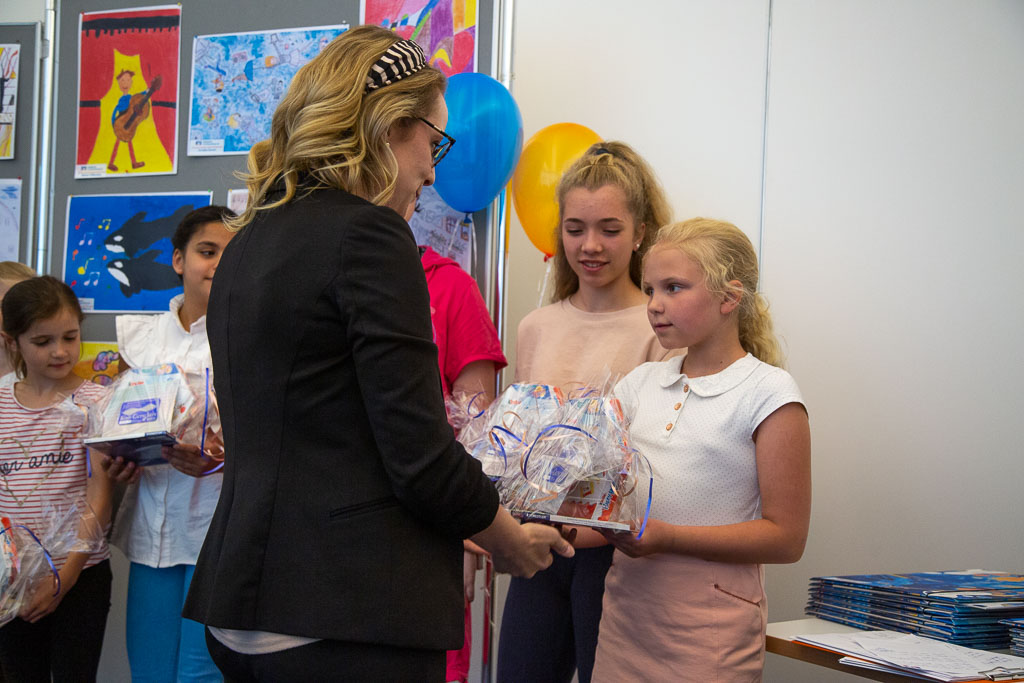 Aline Möller, Frederike Melching, Steffanie Bock und Michelle Hagedorn von der Volksbank in Schaumburg überreichten den Landessiegern Urkunden und Geldpreise und den Ortssiegern Kinogutscheine im Rahmen einer festlichen Siegerehrung. Schulklassen von insgesamt 18 Schulen aus dem Landkreis Schaumburg hatten Ihre Wettbewerbsbeiträge in der Volksbank in Schaumburg abgegeben.