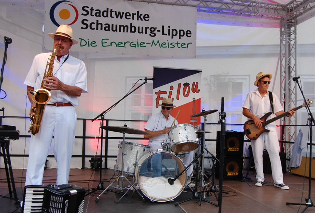 In diesem Jahr werden es drei tolle Abende mit wunderbaren Künstlern: Am 10. Juli startet die beliebte Band „FILOU“ – seit Jahren ein fester Bestandteil in der Bückeburger Musikszene. Die drei Tonkünstler laden zum musikalischen „Apéritif mit FILOU“ in entspannter Atmosphäre mit einer leichten Brise aus Chanson, Musette, Swing und Evergreens ein.