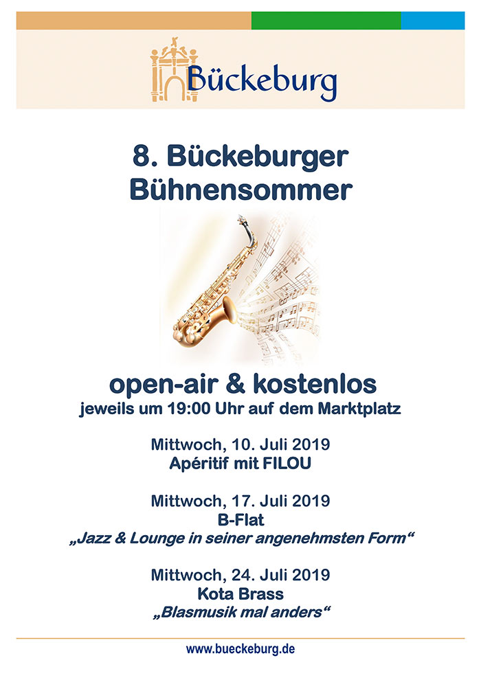 Am 17. Juli spielt dann die Band „B-Flat“. Einige Bückeburger kennen sie schon von „Bückeburg glüht auf 2018“ – nun gibt es sommerliche Jazzmusik mit einer außergewöhnlichen Stimme!