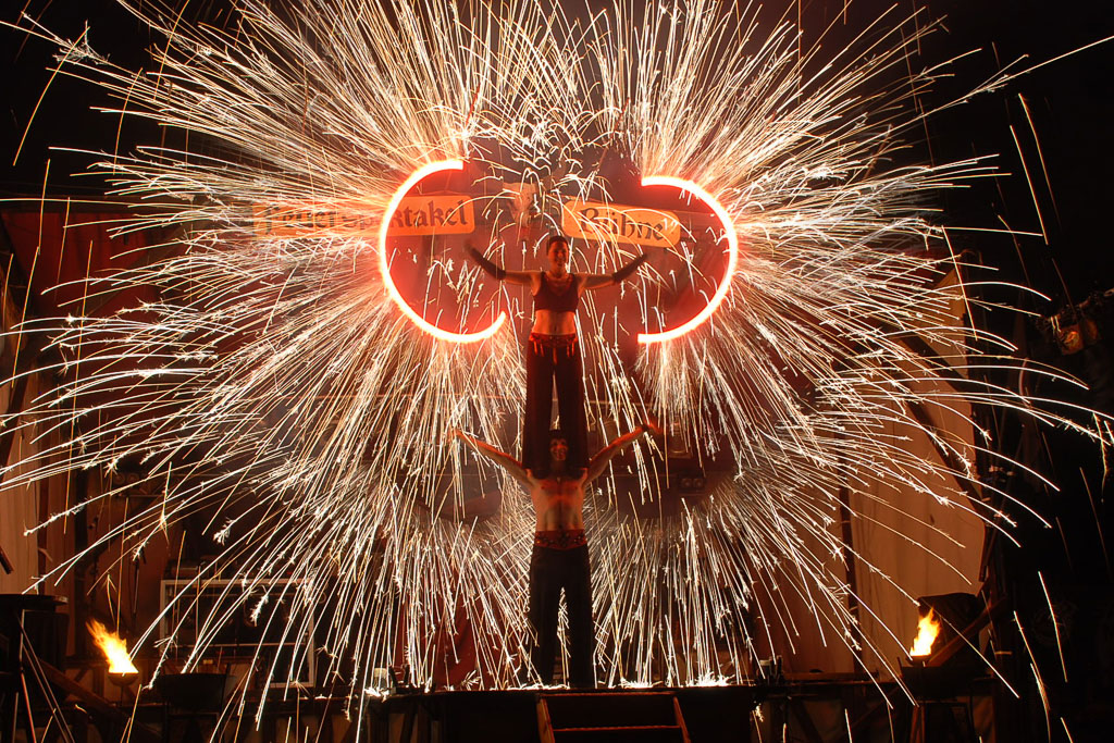 Nach Einbruch der Dunkelheit beginnt der große Pestumzug, und die Gäste versammeln sich zur Nachtfeuershow der Ritter zu Pferde, an die sich das große MPS-Feuerspektakel anschließt.