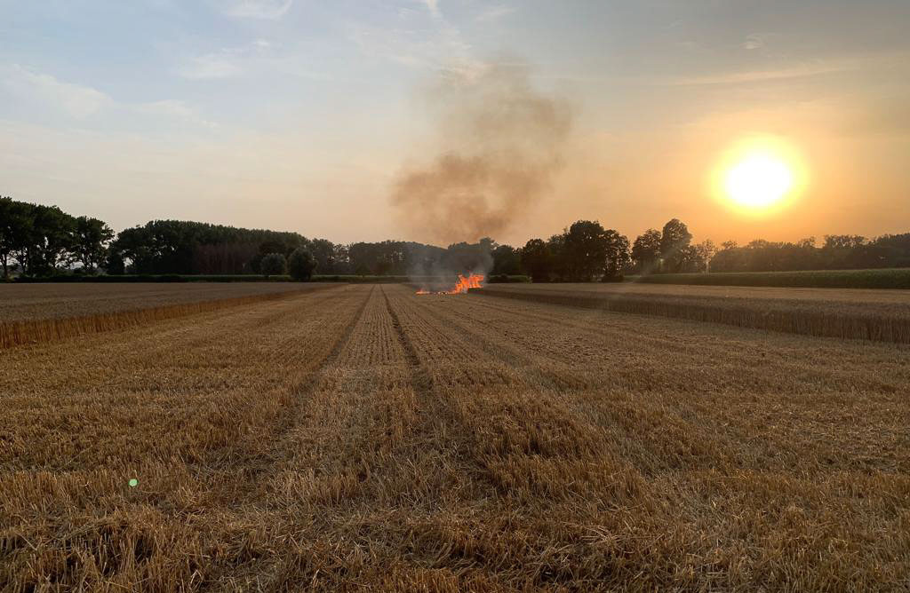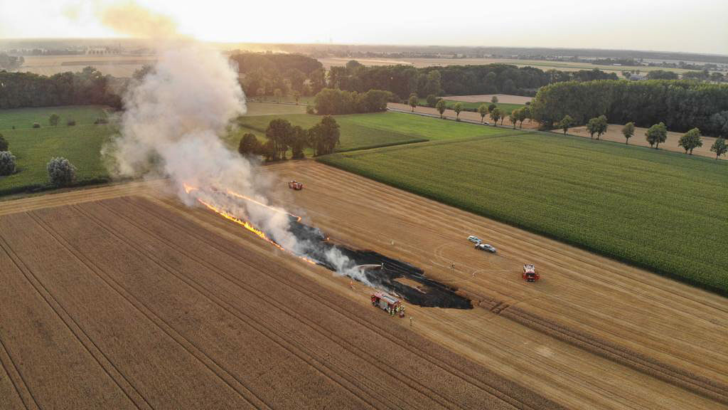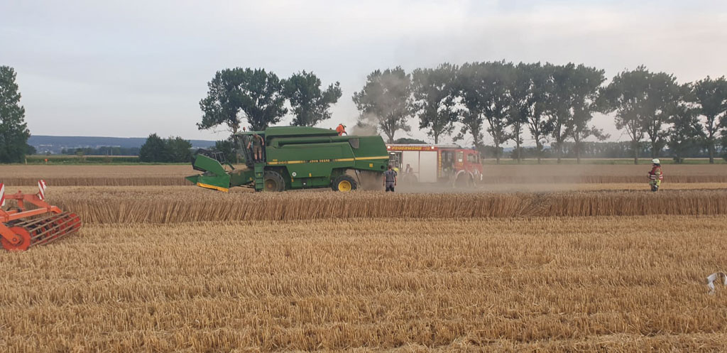 Dort war ein Landwirt gerade dabei, mit seinem Mähdrescher sein Getreidefeld zu mähen. Aus unbekanntem Grund gerieten ca. 1.000 Quadratmeter des Feldes hinter dem Mähdrescher in Brand. Auf der Anfahrt der Feuerwehr war bereits eine große Rauchentwicklung zu erkennen. Das Feuer war etwas abseits eines Weges mitten im Feld ausgebrochen. Die alarmierten Kräfte konnten durch den Einsatz von ca. 10.000 Litern Wasser das Feuer eindämmen und schließlich löschen.
