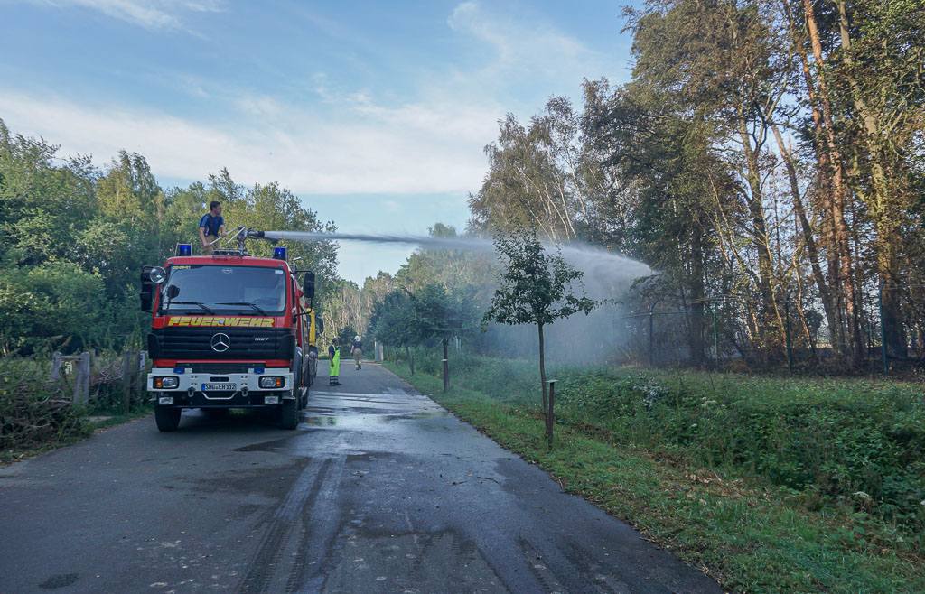 Schnell waren auch einige Bauern mit Treckern und Wasserfässern sowie Grubbern vor Ort. Durch den massiven Einsatz konnte der Brand auf dem Feld zügig gelöscht werden, allerdings hatte das Feuer angefangen, auf den Wald überzugreifen und drohte, einen größeren Waldbrand auszulösen. Erschwerend kam noch hinzu, dass sich im Wald die Wildtier und Artenschutzstation befindet.