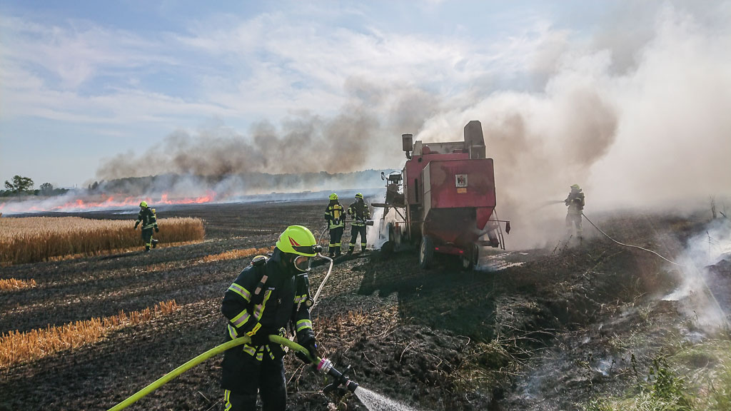 Bereits auf der Anfahrt war eine starke Rauchentwicklung auszumachen. Vor Ort hatte ein Mähdrescher Feuer gefangen und das noch nicht gemähte Feld entzündet. Durch den Wind aus Osten wurde das Feuer in kurzer Zeit etwa 700 Meter in Richtung Wald getrieben. Die ersten Einsatzkräfte haben den Mähdrescher mit Schaum abgelöscht und versucht, das Feuer einzudämmen.