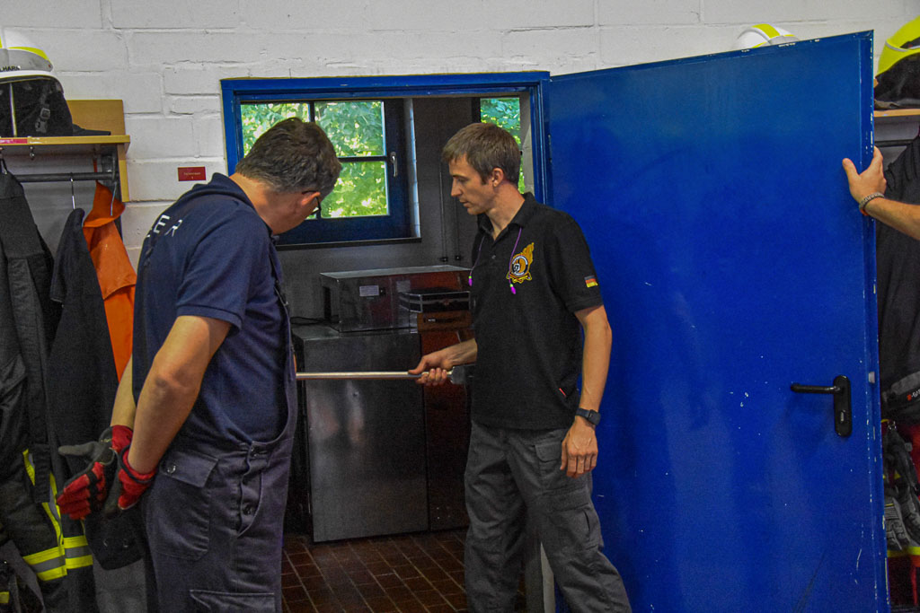 Neben den rechtlichen Grundlagen der gewaltsamen Türöffnung, stand auch die Aufgaben- und Geräteverteilung im Trupp auf der Agenda. Ebenfalls wurde die richtige Lageerkundung einer Wohnungstür erläutert und demonstriert, „habe ich zum Beispiel Temperatur, Verformungen oder Verfärbungen an der Tür?“, solche Erkundung sind wichtig und können die Einsatzkräfte vor weiteren Gefahren bewahren. Desweiteren wurde das richtige Setzen eines Rauchschutzvorhanges, welche eine Ausbreitung des Brandrauches vermeiden soll und das Schlauchmanagement vor der Brandwohnung demonstriert und ausprobiert.