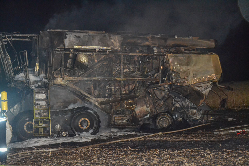 Aktuell bestehen keinerlei Informationen bezüglich Personen- oder Gebäudeschäden. Der Mähdrescher wurde durch das Feuer komplett zerstört, ein Gesamtschaden von ca. 300.000 Euro ist entstanden. (po/Fotos: Polizei)