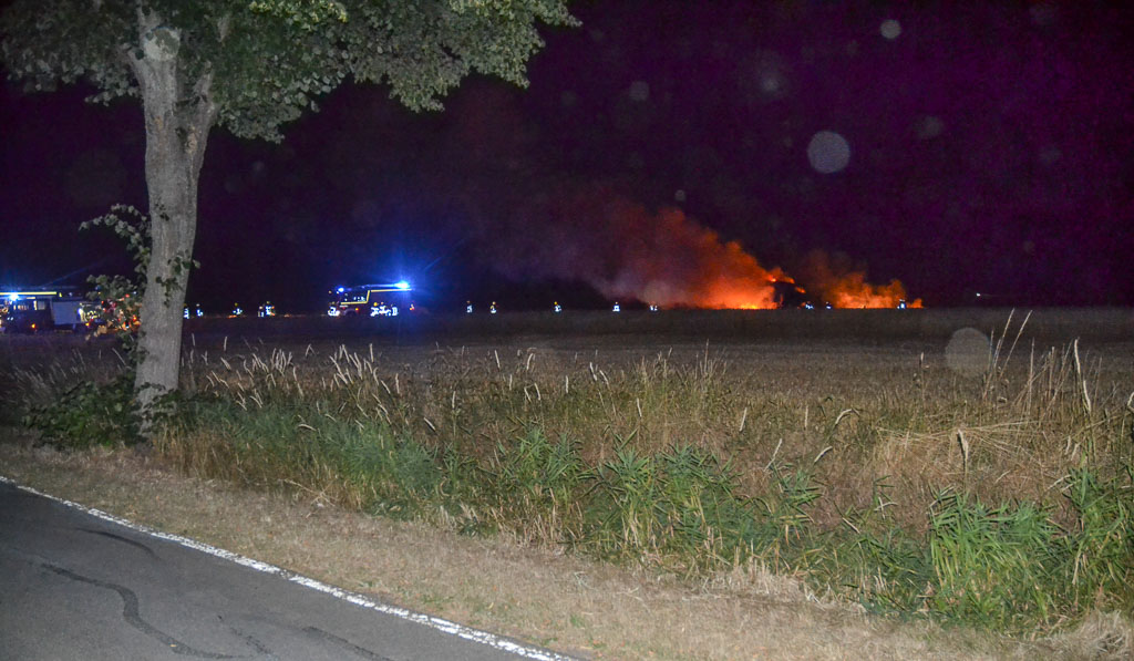 Auf einer Fläche von ca. 30 mal 50 Metern brannte Feld. Ein dort befindlicher Mähdrescher stand in diesem Bereich ebenfalls in Flammen. Insgesamt 114 Einsatzkräfte der Feuerwehren Apelern, Hülsede, Lauenau, Lyhren, Reinsdorf, Rodenberg, Schmarrie, Soldorf und ein Rettungswagen waren vor Ort.