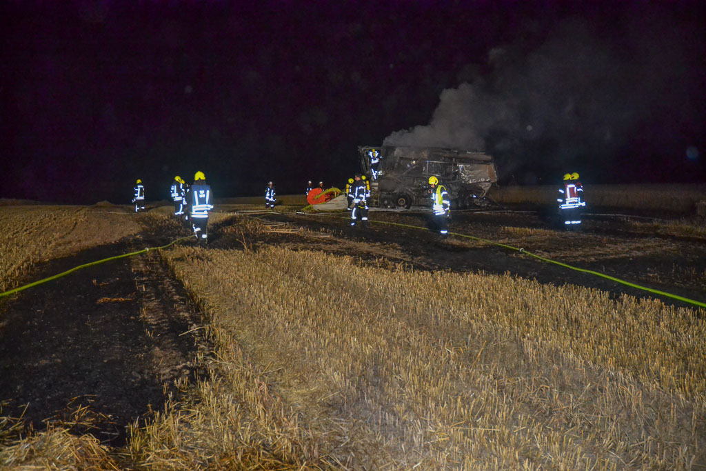 Ein Landwirt (53) hatte das Feld gemäht, als er plötzlich bemerkte, dass der Mähdrescher Feuer gefangen hatte. Der Brand griff anschließend auf das Feld über. Die Löscharbeiten dauerten bis 00:40 Uhr.