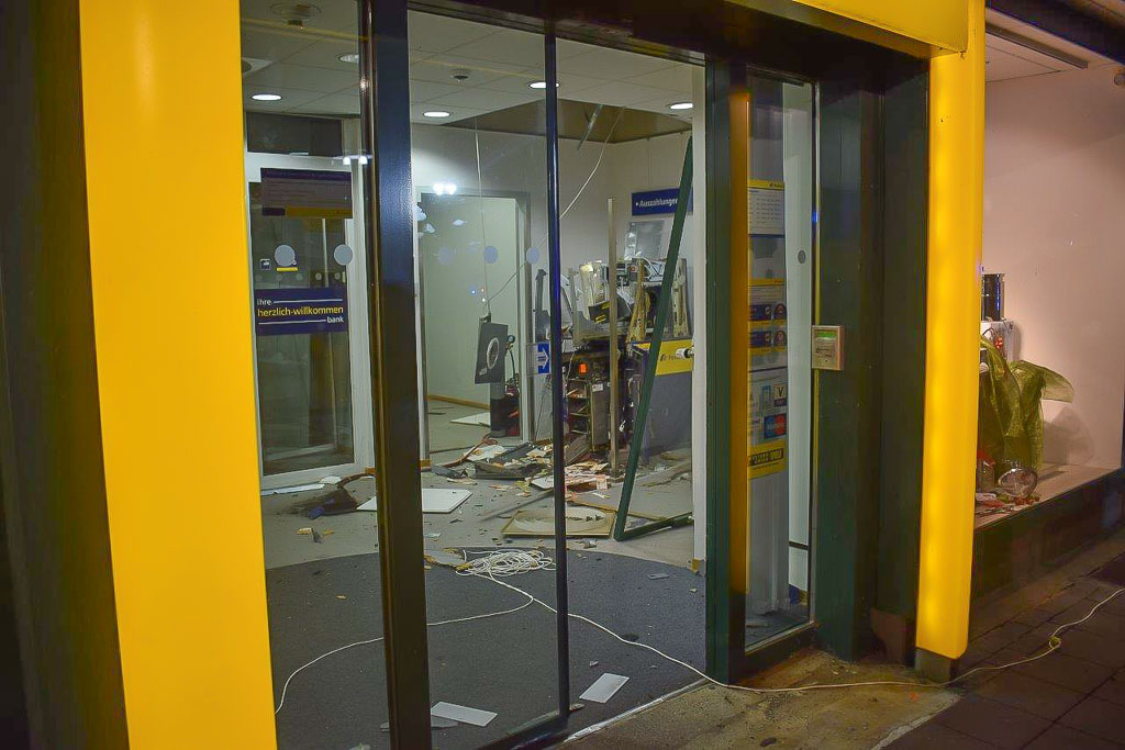 (Bückeburg) Heute Nacht gegen 02.30 Uhr wurde im Vorraum des Postbank Centers am Dr.-Witte-Platz in Bückeburg ein aufgestellter Geldautomat gesprengt, der dadurch völlig zerstört wurde. Im Vorraum kam es ebenfalls zu erheblichen Sachbeschädigungen. Zurückgelassenes Tatwerkzeug wurde durch die Einsatzkräfte vorgefunden und sichergestellt. Momentan werden die auswertbaren Spurenbilder abgeglichen und ausgewertet.