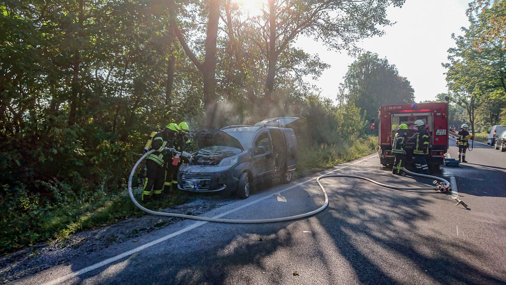 (Wiedenbrügge) Am Samstagmorgen wurden die Feuerwehren Bergkirchen, Wiedenbrügge und Wölpinghausen zu einem brennenden PKW auf der Bundesstraße 441 in Höhe der Kapellenhöhe alarmiert.